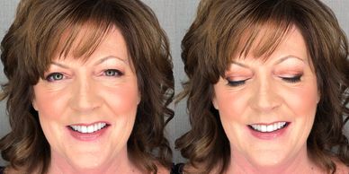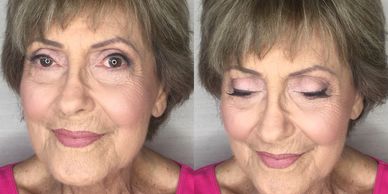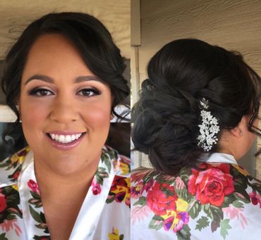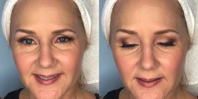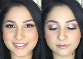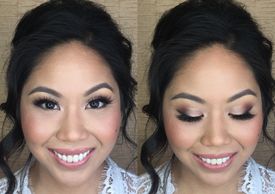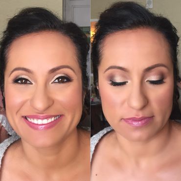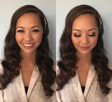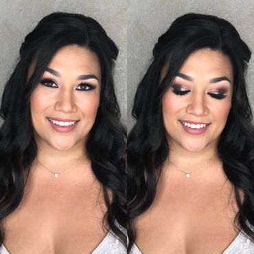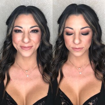 Flawless skin using soft to medium contour and highlight. Light shadow with a soft liner, soft lashes, and a natural lip.