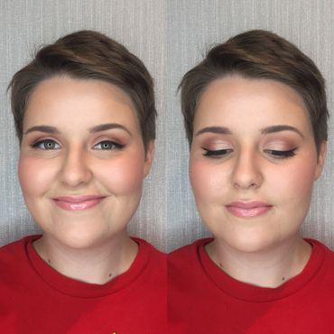 Romantic rosey cheeks with soft kissable lips. Soft, natural shadows with a blurred winged liner and natural lashes.