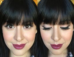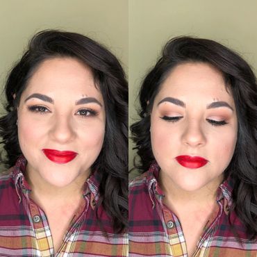 Flawless skin using medium contour and highlight. Light to dark shadow with a crisp winged liner, lots of lash, and a bold lip.